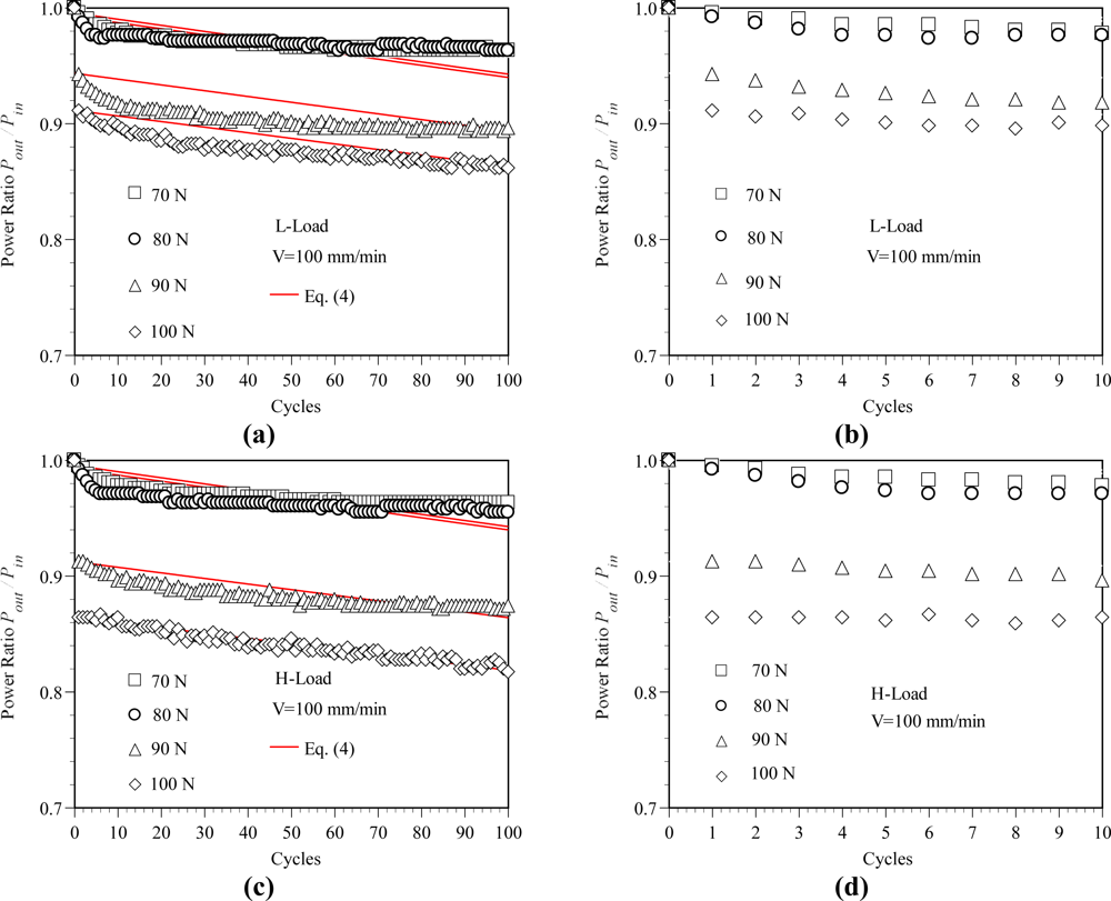 The corresponding variations of the power ratio Pout/Pin with the number of cycles are shown in Figure 6. As shown in the figure, the power ratio Pout/Pin decreases with the increasing number of cycles or the increasing load level. The results shown in Figure 6(a) indicate that after 100 cyclic tests, the power ratio Pout/Pout obtained from the L-Load decreases about 3.7, 4.1, 10.4 and 13.8% at the load levels of P = 70, 80 90 and 100 N, respectively. The corresponding power ratio Pout/Pin obtained from the H-Load decreases about 3.7, 4.5, 12.6 and 18.3 %, respectively. It also can be found that the maximum power loss occurs at the first cyclic test, i.e., CV = 1. The results shown in Figure 6 indicate that the power losses are about 8.9% and 13.6%, respectively, for the L-Load and H-load at the load level P = 100 N and CV = 1. It can be observed from the experimental cyclic load-displacement curves, as shown in Figure 4, that the maximum elongation δ occurs in the first cyclic test. Also, as shown in Figure 3, a larger elongation can result in a larger area under the load-displacement curve, i.e., larger strain energy is accumulated in the deformed POF specimen. This leads to a larger power loss in the POF specimen [15]. In addition, it is observed that the displacement increases with the increasing number of cycles. However, the increase of displacement is slower and gradually reaches a stable value as the number of cyclic tests is greater than 60, as shown in Figure 6. Accordingly, the corresponding power ratio decreases, i.e., power loss increases, with increasing cyclic tests. When the number of cyclic tests is greater than 60, the power losses of the POF specimens decrease very slightly.