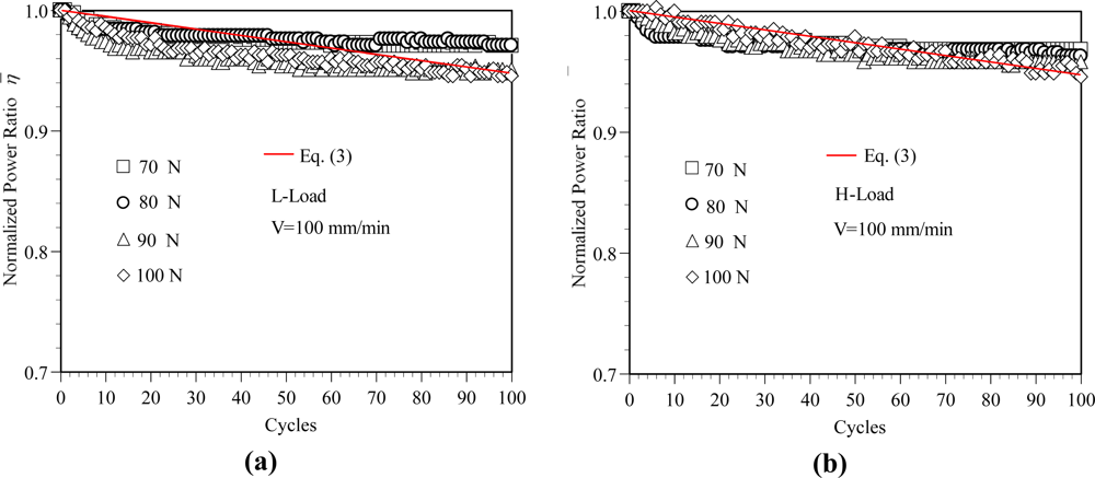 The predicted results obtained using Equation (4) for the variations of the normalized power ratios with respect to the cycles for various load levels are shown in Figure 6 (indicated by the continuous lines). Comparing the two sets of results in each figure, it is found that the difference between them is no more than 3% in each case. The proposed empirical expression can thus provide a good prediction of the power loss as the POF is subjected to cyclic tensile loading.