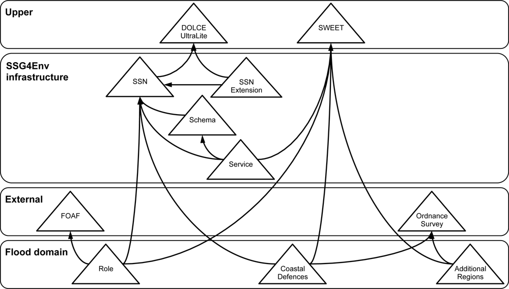 Figure 1 illustrates the ontology network that is used in the flood emergency planning scenario [46]. The ontology network is composed of different ontologies classified in different layers according to whether the ontology can be used to represent: domain-specific information required for the scenario, information required for the infrastructure, or upper-level information used to facilitate interoperability among the other ontologies. These ontologies satisfy the following knowledge representation requirements extracted during the development of the architecture and of the scenario prototype.