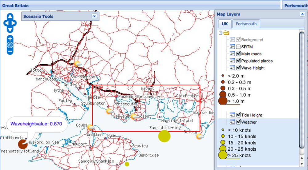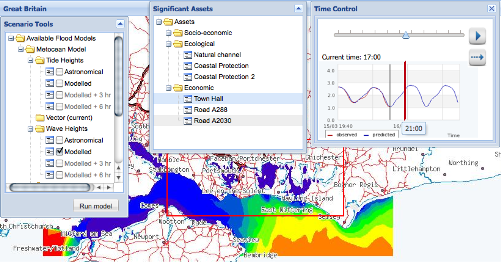 The screenshot in Figure 11 shows a model layer presenting the forecast wave heights as generated by the service described in Section 5.1. The result of the model is superimposed on the sea with different colours (shading) depicting regions with different wave heights. The choice of model to display is controlled by the Scenario Tools pop-up window and the time point in the model is controlled by the Time Control pop-up window. Users can select an appropriate model and forecast period (Astronomical, Modelled nowcast, +3 hours, +6 hours) and then use the time control to animate through 24 hours of the selected model, comparing the model visualisation with a display of the current tide cycle at that time, shown within the Time Control pop-up. The time control is also linked to the Significant Assets window which is populated with the list of man-made assets (road or road sections, buildings, etc.) which are potentially endangered by a flooding event at the period of time defined by time control slider. By selecting different models and forecast periods, decision makers can ultimately compare various flood development scenarios and thus improve risk management procedures.