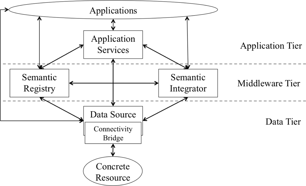 The core service types of the architecture (viz. Data Source, Semantic Registry, and Semantic Integrator) form a service-oriented architecture which supports orchestrations that combine the functionality of services, i.e., service instances are used as building blocks to construct more feature-rich interactions of the services. These services expose their capabilities in terms of a collection of reusable interfaces (specified in Table 1), which have been defined using wsdl [56] and interchange soap messages [57].
