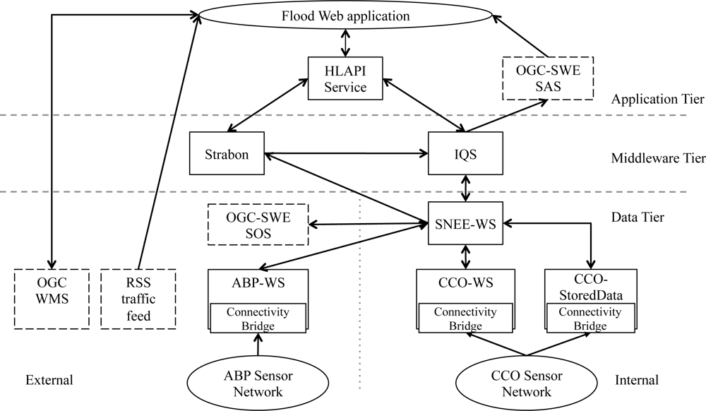 To ease the presentation of the architecture, we draw examples from an environmental decision support scenario for a coastal flood surge. The semantic sensor web service instances deployed for this scenario are given in Table 2. The interactions of these service instances, together with sample ogc-swe services, are depicted in Figure 3. The scenario consists of data being published by a variety of sources: some using the services defined as part of the semantic sensor web architecture. For example, the cco-ws service publishes the sensor readings generated by the cco sensor network [45]; the abp-ws service publishes sensor readings about tides, waves, and weather conditions generated by a sensor network deployed by the Associated British Ports authority [58]; and the cco-stored service publishes stored information relating to the cco sensors such as their associate storm threshold value. Others are ogc defined services (e.g., Web Feature Service, sos, and sas), while others are ad hoc web feeds (e.g., traffic report rss feed). Note that the instance of the architecture deployed for the flooding scenario makes extensive use of the ontology network presented in Figure 1. However, the architecture does not consider the problem of ontology maintenance.