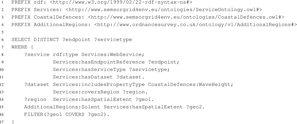 The queries posed to the registry service can request any information that is stored in the registry. The information returned is either in the form of sparql bound variables or an rdf document, depending on the query posed. Thus, the client can retrieve only the endpoints of selected services or all the information stored in the registry about a service. Figure 4 shows an example query posed to the Strabon registry service to discover the endpoint reference and service type of all data sources for the Solent that provide data about wave height sensor readings. Lines 13 and 14 declare the area covered by the dataset, while line 15 declares the region of interest to be the Solent. The FILTER on line 16 ensures that the dataset covers the Solent region. The results are returned as sparql bound variables.