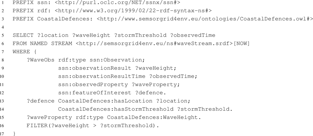 A motivating use case for the integrator, drawn from the flood surge application, is to expose sensor readings and associated metadata for the south coast of England. A user, most likely a domain expert, creates the virtual source by providing a mapping document to the iqs through the Integration interface which states how to relate the source streams of the cco-ws and the abp-ws together with the tables of the cco-stored to the ontological model of the SSN. The integrated data source is automatically registered with the registry service, making it available to all users. Any user can then pose queries over the resulting data source to explore aspects of the data, or indeed be informed of interesting events as characterised by queries over the integrated source. For example, it is desirable to be informed when a sea defence has been over-topped by a wave. This can be determined by a query that relates the wave height readings from the sensor network with the associated threshold value stored in the database. The query over the integrated observation model is shown in Figure 6 expressed in sparqlStream. Line 16 of the query relates the data stored in the cco-stored database with the current sensor reading from the cco-ws, the keyword ‘NOW’ on line 6 limits the sensor readings to the current time-point. The query is evaluated by posing a translated query to the snee-ws distributed query processing service. The snee-ws service poses a query to the locations table of the cco-stored data service and correlates the results with the streams consumed from the cco-ws and abp-ws.