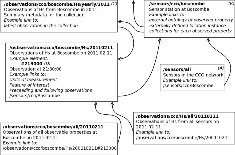 For example, to support mash-up developers in the reuse of sensor data published by the cco sensor network (Section 4.2), we have instantiated a hlapi service to provide access to the observations published by the virtual data source available from the integration service. The deployed hlapi service automatically generates uris for sensors and each observation as data is received from the integration service. It also dynamically organises, and creates as required, the collections to group observations according to their location, the property that is measured, and the time at which it was measured. A selection of resources from this example deployment are shown in Figure 7. A semantic web client might initially access the hlapi service using the uri for all sensor resources (A) (also Table 2). The client can follow the link to the Boscombe sensor resource (B) and request an rdf representation of the Boscombe sensor resource. This representation would contain a semantic description of the sensor in terms defined by the ontology network: including its capabilities, location, and annotated links to collections to which it has contributed observations, such as an annual collection of wave height measurement (C). The latest observation, say 9.30 pm on the 11th February 2011 (D) is accessible through a link. Alternatively a client may receive a link to a specific observation, such as (D). From this resource, the client can follow links to preceding or following observations of wave height from the Boscombe sensor, or to collections of which the observation is a constituent. The rdf representation is best used for semantically navigating the dataset due to library and tooling support. However, once the desired resource is located, the client can request any representation, e.g., geojson to create a layer, through content negotiation.