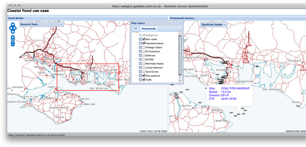 We demonstrate the use of our semantic sensor web architecture in the context of a flood response planning web application. The application is aimed at a variety of user groups from members of the public to those responsible for identifying and responding to coastal flooding events. The application uses the semantic registry service to discover and dynamically incorporate relevant sources of sensed, modelled, and contextual data according to the user’s role and area of interest. Stored and streaming data services are used to access historic and near real-time sensor data, including sources which may have been semantically combined through data integration services. For example, the application provides an innovative tool for alerting users to the incidence and forecast of flood defence over-topping events.