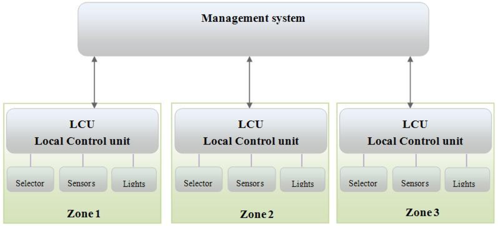 The LACS shown in Figure 1 is composed of the management system and zones of operation. Each zone comprises a Local Control Unit (LCU) with its own activity selector, sensors and lighting units (Illumination Field). Each sensor monitors the illumination over a particular area, referred to as a “workplane”, which may have one or more lighting units. The individual components of the LACS system are as follows: