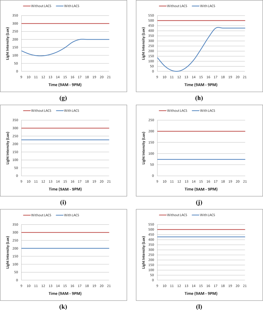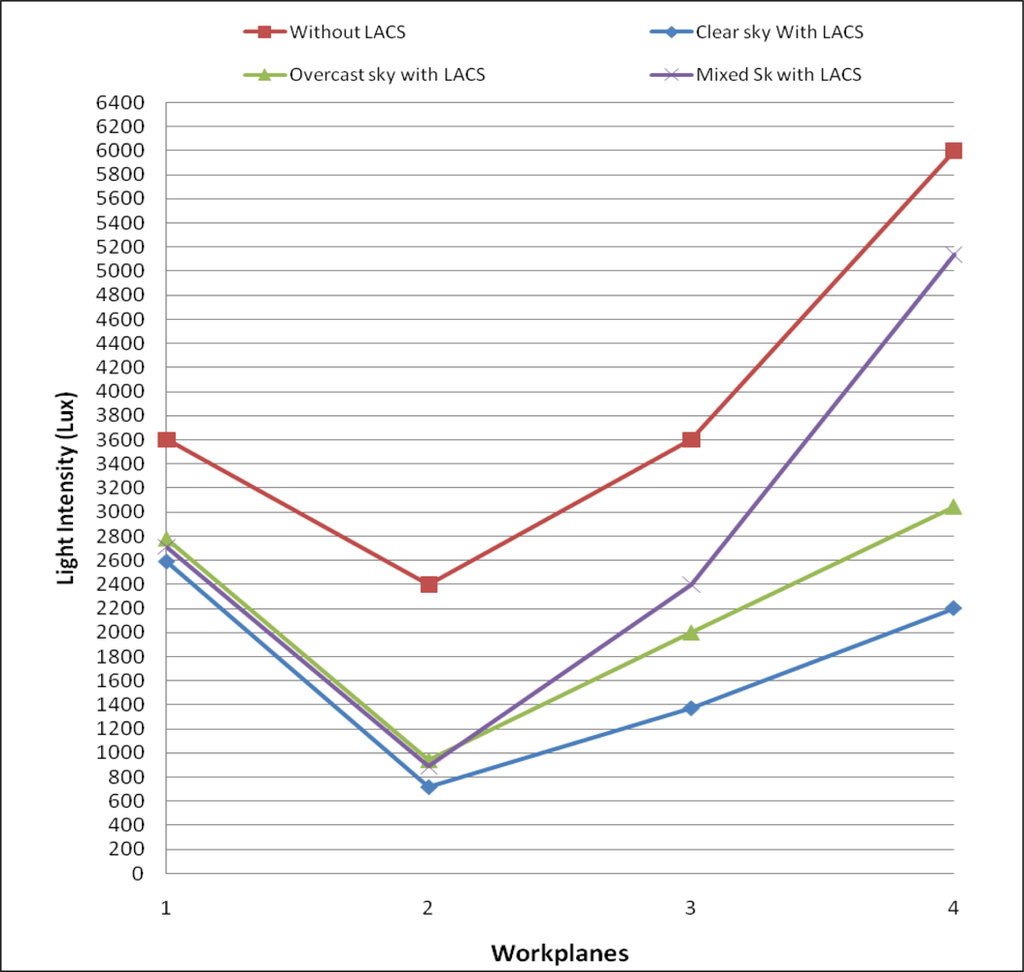 Consider a scenario that requires lighting intensity for conducted activities from 9:00 AM to 9:00 PM. WP1, WP2, WP3 and WP4 need 300 lx, 200 lx, 300 lx and 500 lx, respectively, for their activities. Figure 9 shows illuminance that is provided by the LACS on each wp at different hours and “clear sky”, “mixed sky” and “overcast” states. Total emitted light intensity on workplanes is shown in Figure 10. In the case that the current place did not use light from the LACS, the total of lighting intensity is the highest amount given.