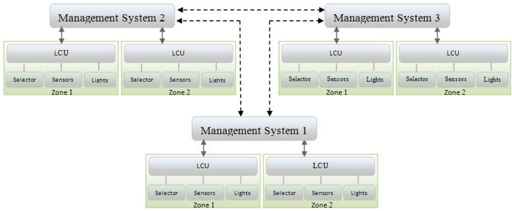 A LACS system can contain various architectures based on application and space used. In Figure 1 an example of a centralized architecture is shown. The management system contains three zones, each of which has its own LCU and a number of workplanes, each workplane including a sensor and associated Illumination Field. Figure 2 shows a distributed LACS architecture. Each manager is independently responsible for several zones. In this architecture managers communicate with each other, for example to announce the change of decision policies or share statistical information.