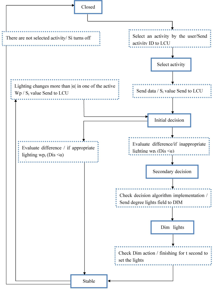 With the sending amount of the sensor (illuminance) for the activated workplane, the current amount of illuminance is compared with the illuminance value for the selected activity in the LCU (initial decision state). If the difference is more than α (|Dis| > α), the system goes to a secondary state for execution of the decision process. Dimmer levels of field lights are determined after the decision process. LCU regulates the intensity of field lights by sending dimmer levels to the light ballasts. Then, the system is placed in the stable state.