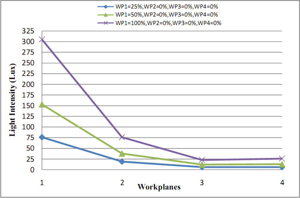 We suggest a method to solve the problem of “sequential lighting changes”. This is based on a decision process. First we define some concepts that are used in this solution. An illumination lighting effect dependency table is constructed by calculating the calculated levels of lighting on each workplane. For example, Table 2 lists the levels required for the four workplane scenario shown in Figure 5. Each row is related to a workplane and each column to an Illumination Field. The first entry in the first column is for the case that Illumination Field 1 has dimmer levels set to 100% and the other illumination fields set to 0%. Other rows of this column are related to spill over from Illumination Field 1’s lighting on the other workplanes. The effect of each Illumination Field on the other workplanes is shown in the remaining columns. In Figure 6 WP1’s Illumination Field is shown for dimmer levels at 25%, 50% and 100% while other workplanes are inactive (dimmer levels are 0%). In this figure the light intensity of all of workplanes in each state level is double that of the previous state level, so by knowing the effect of dimmer levels in an active workplane (while other workplanes are inactive) we can predict the amount of lighting effect that spills over to other workplanes with just a simple proportion at calculation. As can also be seen in Figure 6, with quadrupled lighting intensity values at 25%, a 100% dim state can be gained (without additional measurements).
