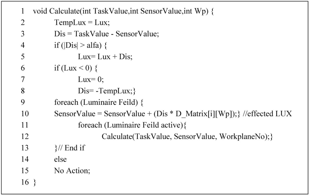 The above concepts have led to a decision process for which the pseudo code is shown in Figure 7. This method receives amounts of selected activity’s lighting intensity, current amount and workplanes number as three parameters. In line 2 the amount of current lighting in lux is saved in an auxiliary variable. The difference between the amount of current lighting and the expected value is stored in the (dis) variable. This value represents the degree of dimming. If this value exceeds α, then there is a requirement to adjust the lighting level. For changing it is sufficient to add the value of current lighting with the (dis) value. If the current lighting is more than expected lighting because (dis) is negative then lux is decreased in the summation operation, otherwise it is added to the current lighting. In lines 6 to 8 the amount of lighting is reduced to the maximum size of existing lighting. In lines 9 and 10 the dimming effect on other workplanes is calculated.