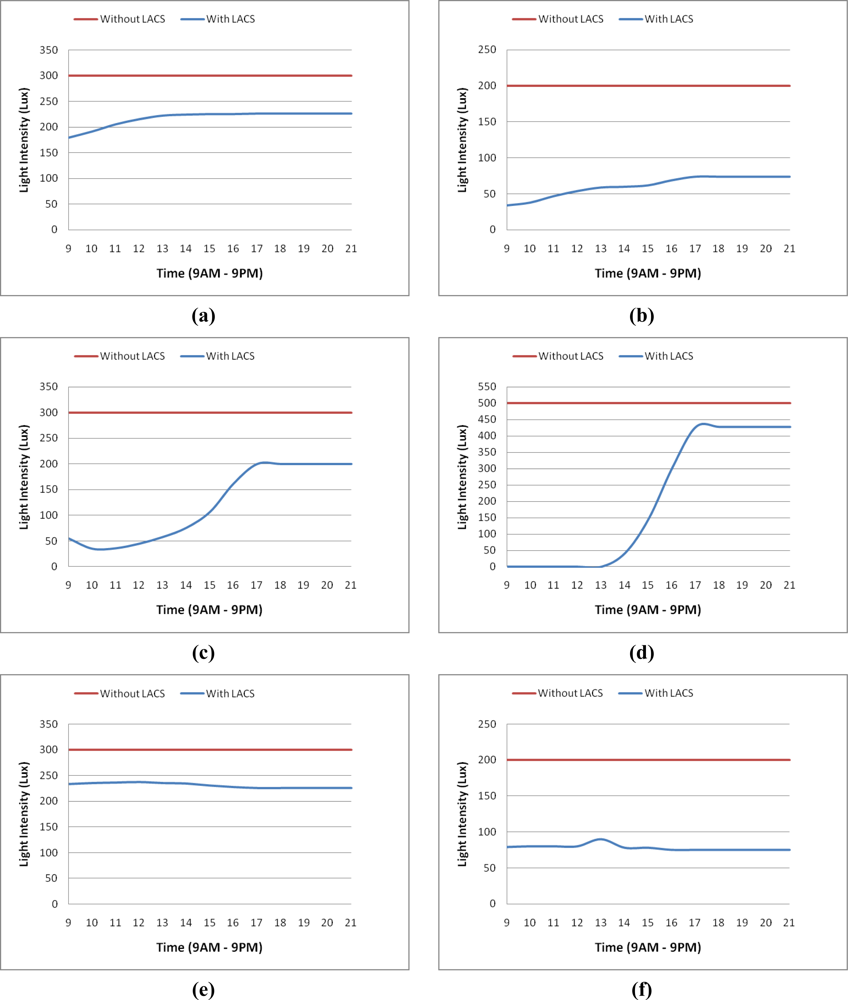 Considered the second scenario that has a building with 20 floors and 40 units, and that all units have two independent rooms (total 80 rooms), and each room is similar to Figure 5. Activities conducted in these rooms are similar to the first scenario. In this building, workplanes of 20 rooms receive no (or little) effect from external lighting and 40 rooms are in receipt of external lighting. Two workplanes of the other 20 rooms are affected by external lighting but another two workplanes are not effected. The total amount of emitted light intensity on workplanes from 9:00 AM to 9:00 PM without using LACS is 1,248,000 lx. The value with using LACS is 646,240 lx in clear sky, 731,340 lx in overcast sky and 890,880 lx in mixed sky. As considered, the total amount of emitted light intensity on workplanes with LACS than compared to those without LACS it has been reduced from 29% to 48%. Also, the number of sensors required for all rooms is 200 instead of using 320 sensors. This is a 37.5% reduction by using the reduced number of sensors method (Section 6).