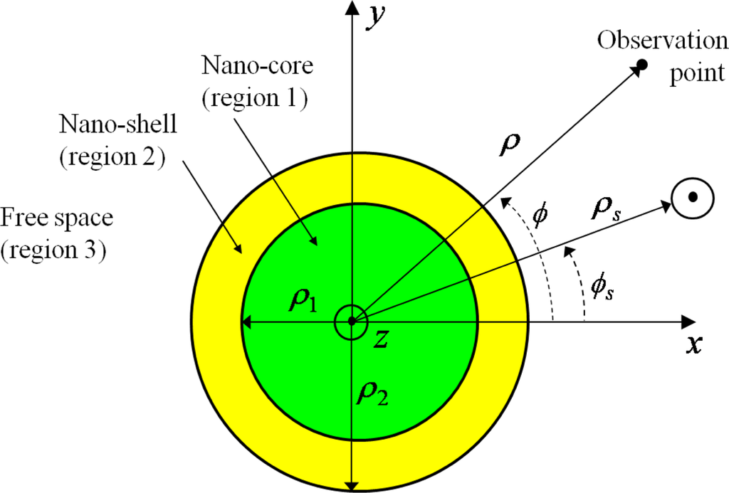 The CNP configuration is depicted in Figure 1. It consists of a cylindrical nano-core (region 1) with radius ρ1, covered with a concentric cylindrical nano-shell (region 2) with outer radius ρ2. The host medium (region 3) of the CNP is that of free-space with the permittivity, ɛ0, permeability, μ0, and wave number, , where λ is the free space wavelength. The CNP is excited by an arbitrarily located line source for which two polarizations are considered: the TM (with respect to z) polarization, in which case the source is an electric line source (ELS) with constant electric current Ie [A/m], and the TE (with respect to z) polarization, in which case the source is a magnetic line source (MLS) with constant magnetic current Im [V/m]. The two regions 1 and 2 consist of simple, lossy materials with the permittivity, ɛi = ɛ′i − jɛ″i, permeability, μi = μ0, and wave number , i = 1 and 2, where the branch of the square root will be discussed below. A cylindrical coordinate system (ρ, ϕ, z) and an associated rectangular coordinate system (x, y, z) are introduced such that their origins coincide with the center of the CNP. The coordinates of the observation point are (ρ, ϕ), and those of the line source are (ρs, ϕs).