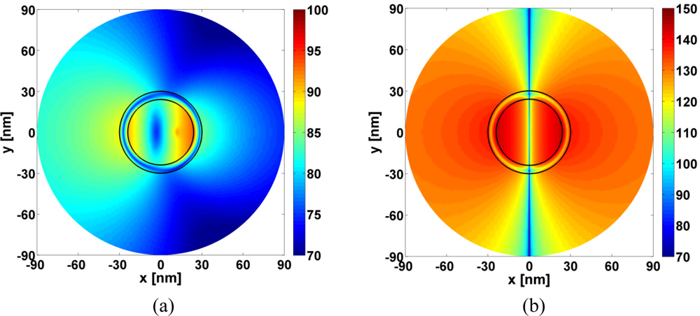 These conclusions are further illustrated with Figure 4 which shows the quantity 20 log10 |E⃗(ρ, ∅)|, where E⃗(ρ, ∅) is the total electric field normalized by 1 V/m, in a circular region of radius 90 nm for the Ag-based CNP for κ = 0 and λ = 324.6 nm [Figure 4(a)] and κ = −0.87, λ = 320 nm [Figure 4(b)]. In both cases, the field is dominated by that of the ELS alone, i.e., the CNP does not exhibit any influence on the ELS or the local field distribution. Although not shown, similar results were found for the Au- and Cu-based CNPs.