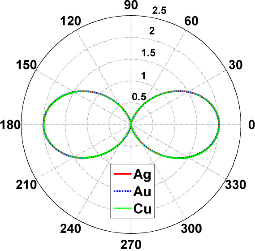 Having discussed the near-field and the NRR results for a number of active CNPs, we next briefly illustrate their far-field radiation characteristics in terms of their directivity patterns. These are shown in Figure 8 for the super-resonant Ag-, Au-, and Cu-based CNPs when the MLS is inside the CNPs at (ρs, ϕs) = (12 nm, 0°). When the MLS is outside the CNPs at (ρs, ϕs) = (31 nm, 0°), the same result is obtained. For both locations of the MLS, all three CNPs lead to exactly the same directivity patterns, i.e., they are symmetric dipolar patterns. Moreover, they all have a maximum directivity of 2. These far-field behaviors agree with the corresponding near-field results. This also means that the super-resonances reported in Figure 5(b) are indeed due to a strong excitation of the dipole mode in the respective CNPs, as noted earlier.