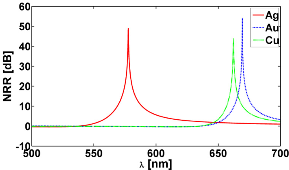 The supe-resonant properties of a number of cylindrical active CNPs excited by a MLS have so far been examined. With this in mind, it is very interesting to note a few differences between these CNPs and the correspondingly sized spherical active CNPs studied thoroughly in [7] for the case of an electric Hertzian dipole excitation. In order for the super-resonances to occur lower magnitude values of the parameter κ are needed in the cylindrical active CNPs than in the spherical ones, i.e., a lower amount of gain is needed in the former than in the latter CNP configurations in order to overcome the intrinsic plasmonic losses. Moreover, the super resonances occur at larger wavelengths for the cylindrical CNPs than for the spherical CNPs, and they result in significantly lower NRR values for the former. These behaviors would have significant impact on any nano-sensor application. Another interesting and important difference between the two geometries is the inability of the cylindrical CNPs to provide reduced NRR values for the examined range of parameters. In [7] it was shown that for the source location outside the super-resonant spherical CNPs, both enhanced as well as reduced NRR values can be obtained. However, as Figure 9 demonstrates, when the MLS is outside the Ag-, Au-, and Cu-based CNPs at (ρs, ϕs) = (40 nm, 0°), only the super-resonances and no reductions in the NRRs are in evidence; similar results are obtained for other locations of the MLS outside the CNPs.
