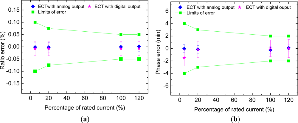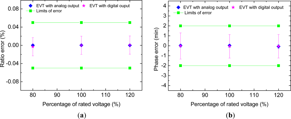 In order to evaluate the performance of EVTs/ECTs testing device, the and (or , ) can feed into the reference channel and the tested channel, respectively. For measuring and metering purpose introduced in the IEC standard (IEC 60044-7, IEC 60044-8), the ratio error and phase error at the voltage between 80% and 120% of the rated voltage and at the current between 5 % and 120% of the rated current, should be taken into consideration. As a result, in the evaluation of the testing device, the rated value of testing voltage is V (Urated) which is equal to the rated output voltage of the reference voltage transformer and the tested voltage values are 80% Urated, 100% Urated, 120% Urated, The rated value of testing current is 5 A (Irated) which is equal to the rated output current of the reference current transformer and the tested current values are 5% Irated, 20% Irated, 100% Irated, 120% Irated.