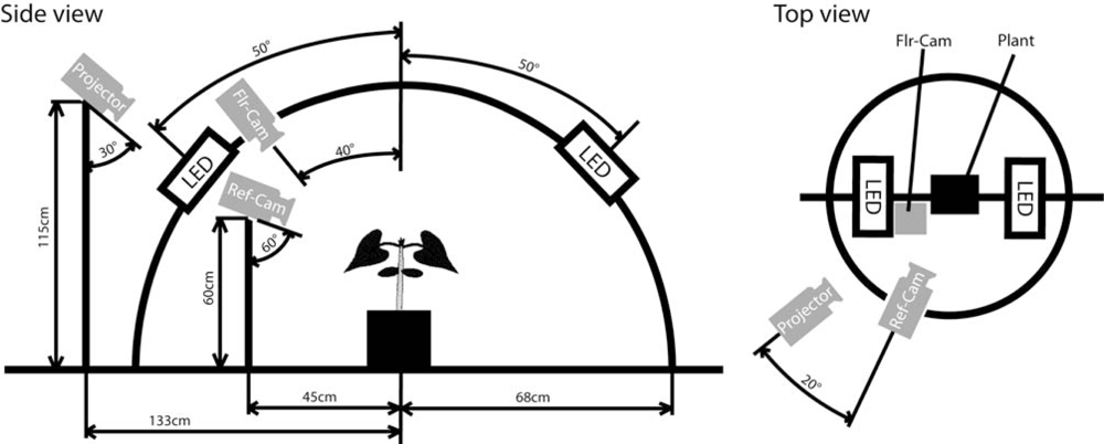 The 3D imaging was performed using a goniometric plant imaging system developed by Photon Systems Instrument, Ltd. (Brno, Czech Republic, http://www.psi.cz/products/customized-fluorcams/arch-fc-900-a). This system (Figure 1) has been originally designed for ChlF imaging of plants from various angles under a changing angle of irradiation that would mimic the Sun’s movement in the sky.