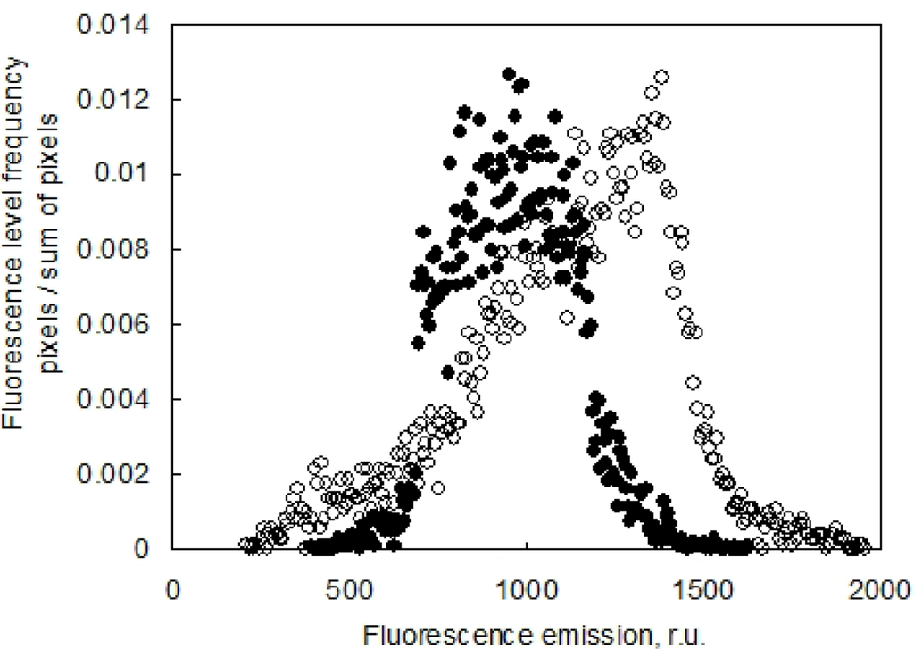It is important to note that the advantage of combining the ChlF imaging with 3D computer reconstruction is a correct re-normalization of the signal to the leaf angle. In Section 2.3 we discussed the angle effect on ChlF signal captured by the camera. The effect of leaf angle is demonstrated in Figure 10, where the histogram of Fs signal obtained before (in standard 2D imaging) and after the re-normalization (3D reconstruction of the fluorescence emission) is presented. The difference between the uncorrected (open symbols) and corrected fluorescence signal (closed symbols) is due to an average leaf declination of 38° of the particular pepper leaf. The difference is even significantly larger in wilted leaves.