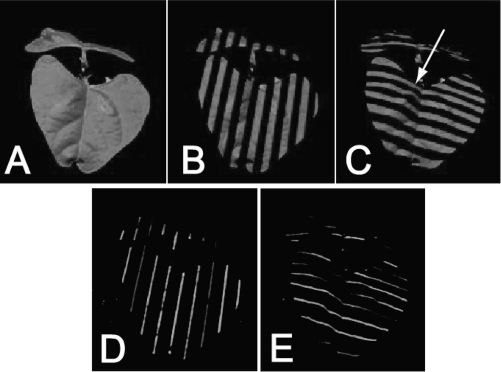 To explore the resolution limits of the employed approach, we also used fine projector patterns (Phase Shift Sequence). The Phase Shift Sequence consisted of 1-pixel wide white lines that were intervened with 15-pixel wide black stripes (Figure 2(D,E)). Sixteen such images were projected. They differed in the relative positions of the white stripes that were shifted by one pixel in the consecutive imaging steps. The same operation was repeated for the perpendicular orientation of the stripes, so we obtained 32 plant images in the Phase Shift Sequence illumination pattern. Thus, the coded light sequence was formed by 48 pictures in total: 16 plant pictures in Gray code illumination patterns (Figure 2(B,C)) and 32 plant pictures in Phase Shift Sequence illumination patterns (Figure 2(D,E)).