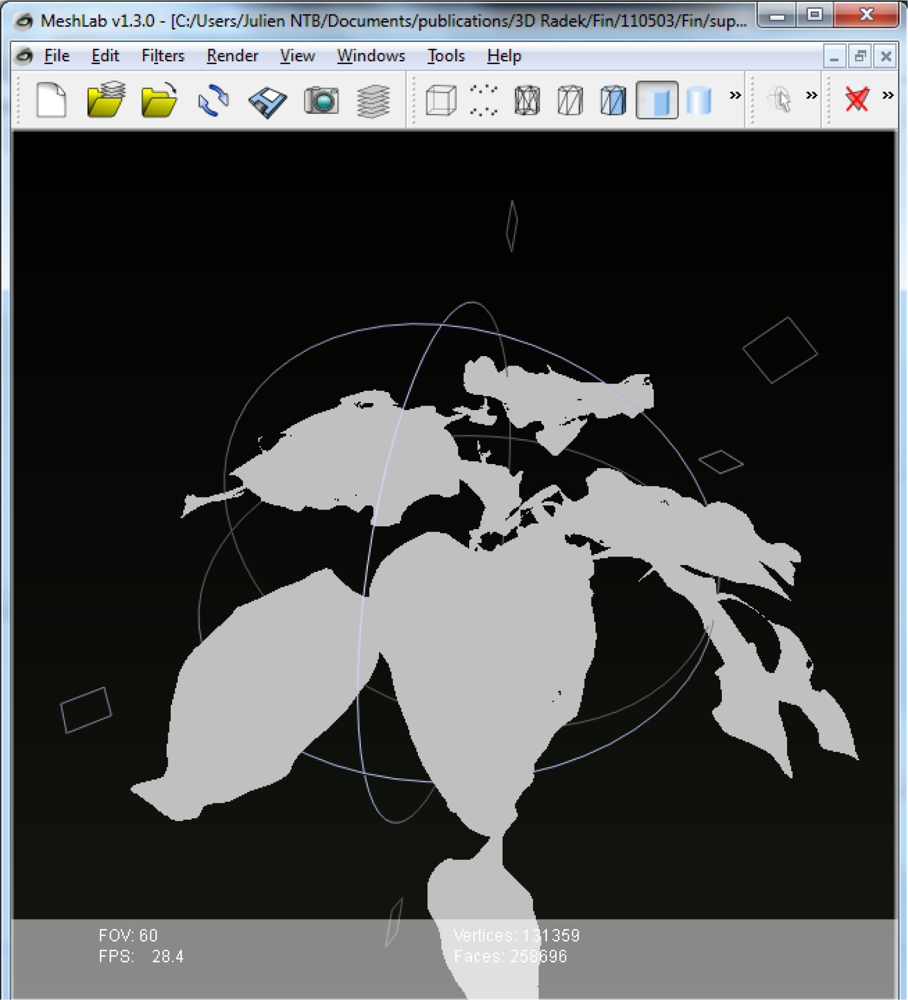 In order to reduce noise in the 3D reconstruction, we excluded isolated points that had less than 10 other points in their vicinity (that was defined by a sphere of 5 mm diameter). This selection criterion was identified empirically; points that were more than 5 mm apart frequently originated in the empty space, e.g., between two neighboring leaves. Each point in the 3D space identified as belonging to the plant was connected to the two closest neighbor plant points creating a triangle in the Delaunay method [57,58]. The 3D reconstruction of the plant surface was, thus, generated from such elemental triangles.