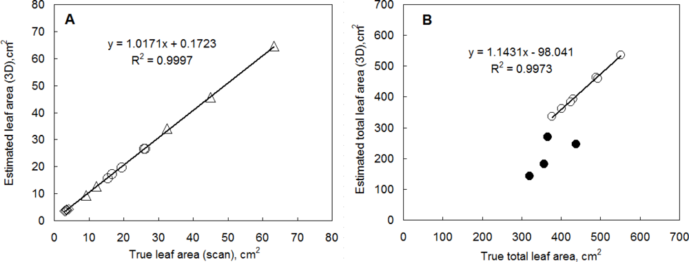 The leaf area and leaf angle calculated from a 3D reconstruction are features of high relevance that can be easily verified by direct measurements. In order to test the accuracy of the 3D reconstruction, we reconstructed individual leaves of several plant species that differed in their leaf size and morphology (bean, cycad, hibiscus). Leaves were left attached to the plant in their natural position. Figure 4(A) shows a high correlation between the leaf area determined by 3D imaging system and the scanned leaf area. The leaf size was between 3 and 65 cm2. The 3D reconstruction yielded high fidelity estimates.