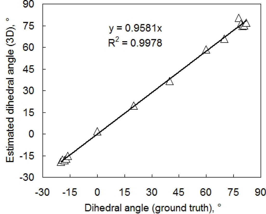 Leaf angle is another important parameter. To evaluate the accuracy of leaf inclination estimate we cut two leaves from a bean plant and glued them to two flat supports. The first leaf was placed in a horizontal position near the center of 3D imaging system. The second leaf was placed nearby on a adjustable holder so that the angle between the leaf and RefCam camera axis could be modified. For each chosen angle, the two leaves were imaged and the dihedral angle between the two leaves was determined from the resulting 3D reconstruction. The reference measurement was performed using a water-level inclinometer (with a precision of approximately 1°). The correlation between reference and reconstructed angle is shown in Figure 5.
