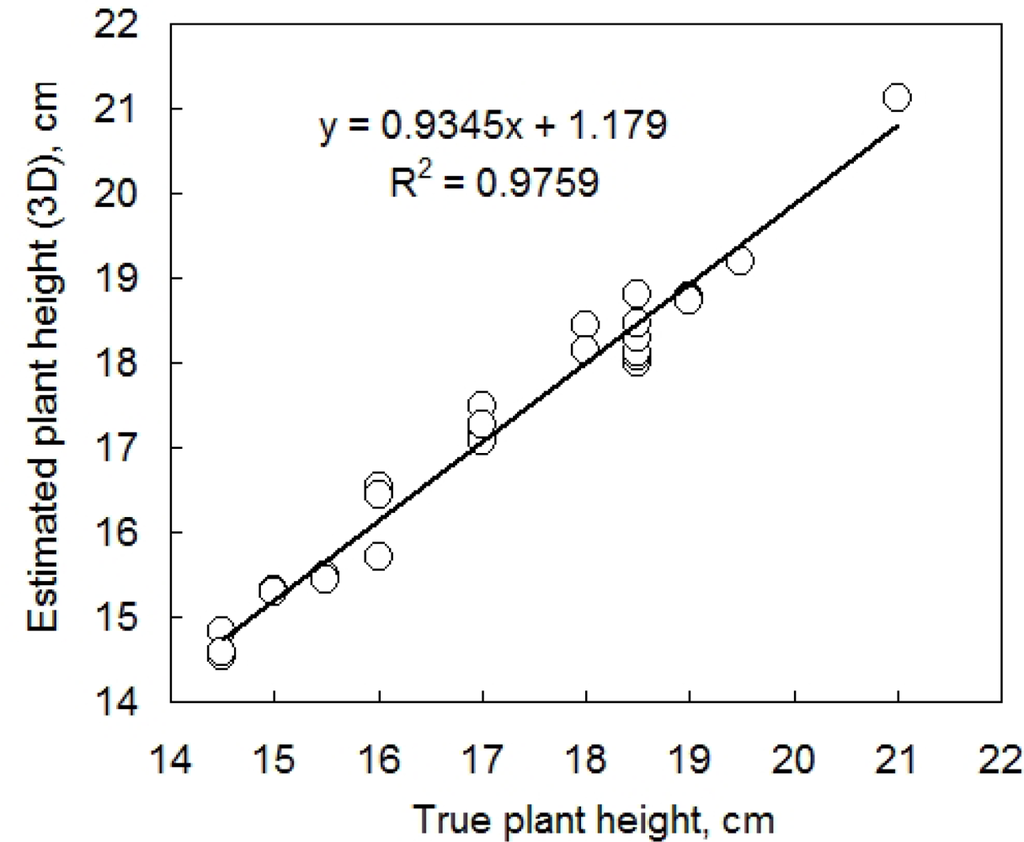 Further, we tested the accuracy of plant height determination in the 3D computer reconstruction (Figure 6). The plant height was calculated as a position of the highest point of plant 3D reconstruction minus the pot height. The true plant height was measured by a ruler. These two measurements were compared daily on 14 individual pepper plants during five consecutive growth days. Both plant height and leaf angle were precisely estimated by 3D reconstruction. Figure 6 informs also about the precision of the measurement: the computer reconstruction was able to resolve clusters of plant heights that were indistinguishable with the ruler. In fact measuring the plant with a ruler disturbs the position of the leaves and required rounding to the closest 5 mm, while the 3D reconstruction is able of measuring precisely the plant without any disturbance.