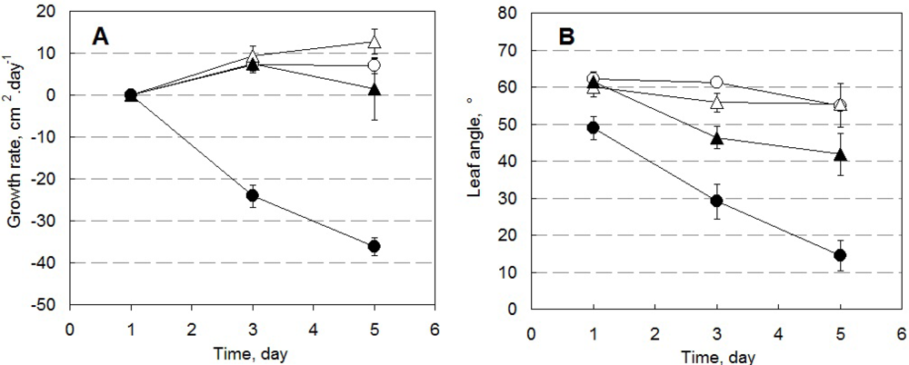Pepper plants in HW, HS, LW, and LS conditions differed in their growth rate, leaf angle as well as in ChlF emission. Figure 7 shows growth rates calculated from the change of total leaf area determined by the 3D imaging system (Figure 7(A)), and from the change of leaf angle (angle between the plane passing through the leaf and the vertical axis) during 5 days of the experiment (Figure 7(B)). The negative growth rate shown in Figure 7(A) for drought-stressed plants in high light is a result of leaf overlap that obscures some leaf area in the 3D reconstruction.
