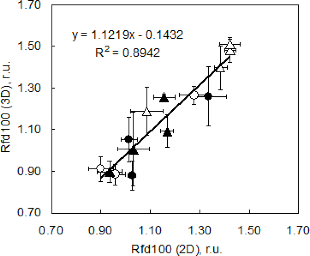As a suitable ChlF parameter we chose to image Rfd100 (= (Fp − Fs)/Fs, where Fp is fluorescence at peak P and Fs is for fluorescence at the steady state level under 100 μmol (photons) m−2·s−1). Rfd100 can be recorded without application of saturating pulse that may be difficult to achieve in complex plant canopies and in automated high-throughput experiments. Rfd100 was chosen to serve the purpose of the presented case study: to show the capabilities of 3D ChlF imaging. We propose that a different experimental setup might be appropriate for a more complex physiological screening. Figure 8 shows a correlation of the Rfd100 index measured in the goniometer setup (Figure 1) and projected on the 3D reconstruction of pepper plants with reference measurements done using a FluorCam conventional imaging fluorometer. Both measurements were done on the same leaves, i.e., on 5th and 6th leaves of each measured plants. Symbols represent means of five repetitions, and error bars show standard deviations. Symbols differentiate between high light acclimated plants that were well watered (open circles) and drought stressed (closed circles) and low light acclimated plants that were well watered (open triangles) and those that were drought stressed (closed triangles).