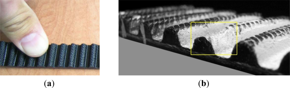 The first case study which was used to test the SyPreF included a timing belt tooth (Figure 10(a)), specifically—a tooth part which has a factory error (Figure 10(b)). Specific features of this case study are very small object dimensions and non-contact 3D digitization, which was performed by a laser triangulation sensor (Figure 11). The resulting point cloud (Figure 12(a)) consists of 1,482,000 points and contains substantial errors which are inherent to this non-contact method, and it also features high resolution (5 μm).