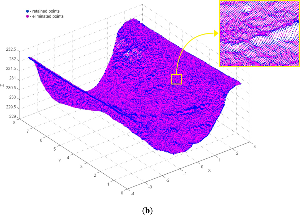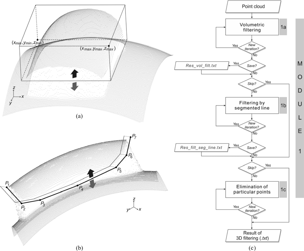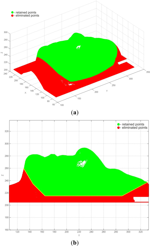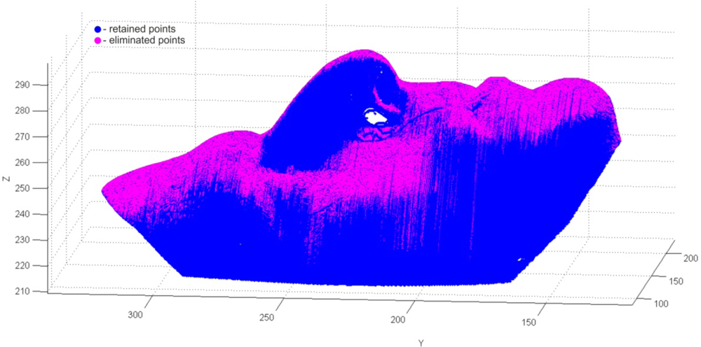 The third tool allows individual selection of a larger number of points which could not be eliminated using the first two tools. Selection is performed in a graphical mode, from the point cloud. The three tools can be used each by itself, or in any other combination, iteratively, as shown by the algorithm in Figure 2(c).