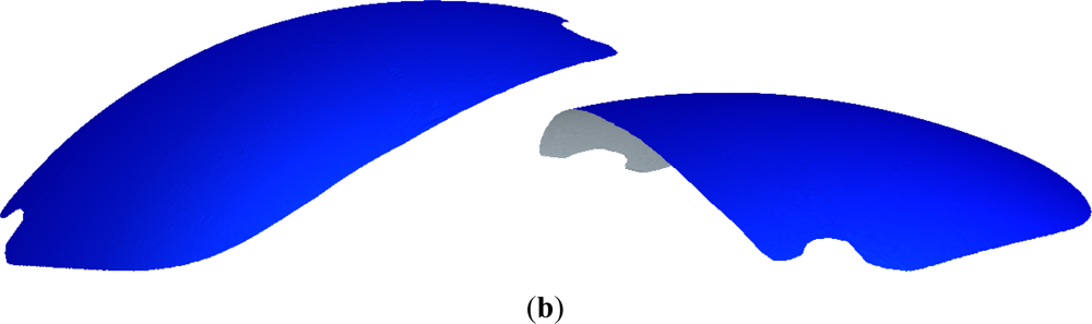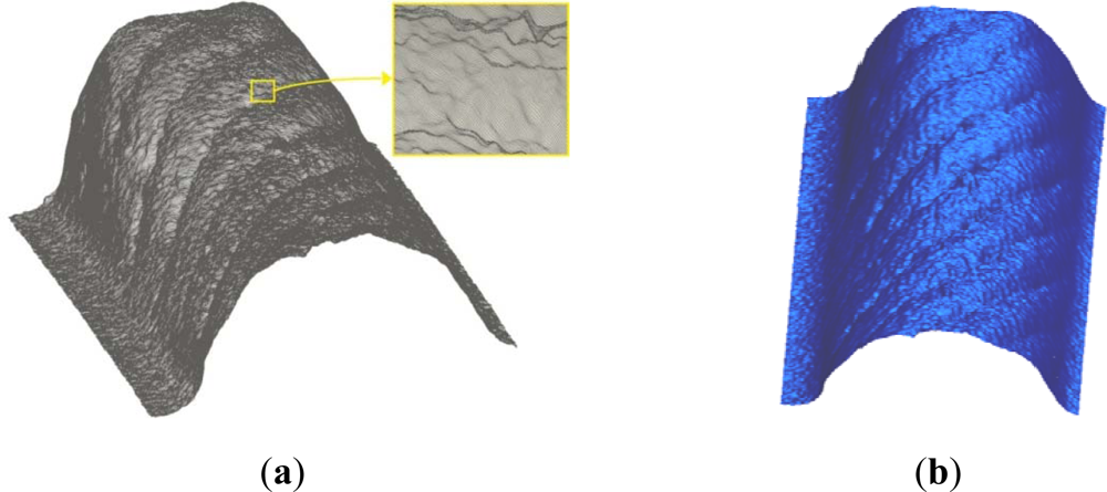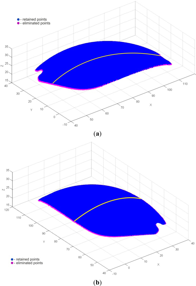 Cross-sectional filtering/smoothing of point data was performed in the next phase of pre-processing and comprised elimination of end points in two iterations—1st along the y axis, and 2nd along the x axis (due to the disposition of points it was possible to eliminate end-points along two axes). This tool was applied because of a higher probability of error-points around the object’s rims, caused by the transition of the digitization sensor probe from object to fixture and measuring table. Within the 1st iteration, along y axis, a total of 2,586 points (3 points at each end in all of the 429 cross-sections) were eliminated (Figure 23(a)). Likewise, in the 2nd iteration along x axis, a total of 2,748 points (2 points at each end in all of the 687 cross-sections) were eliminated, so the resulting point cloud contained 219,082 points (Figure 23(b)).