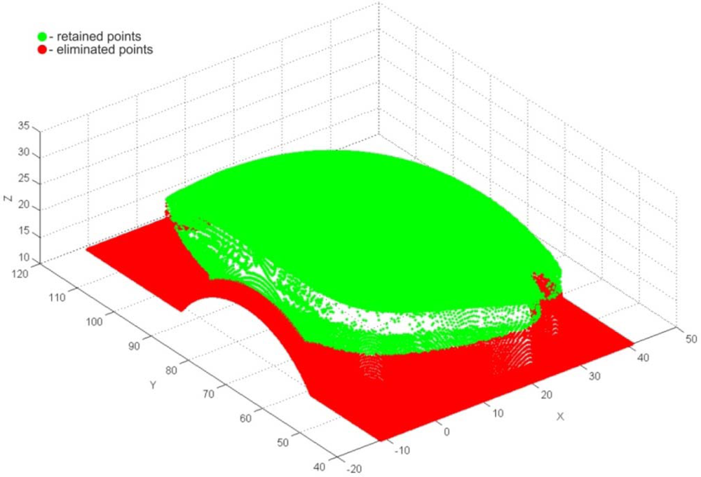 3D digitization most often results in numerous unwanted points. These points frequently belong to objects which surround the object being digitized, such as fixtures, measurement table, or some other part of the assembly to which the digitized part belongs. However, in the case of non-contact methods, such as the laser triangulation, those points can originate from objects located further away. To some extent, the unwanted points can also be the result of measurement errors (due to operator errors, system-specific errors and/or errors due to specific nature of the digitized object, some external disturbance i.e., vibrations), etc. Those points, as described in the Introduction section, have to be eliminated in order to maintain quality of surface reconstruction. The module for 3D filtering of errors was developed to allow elimination of unwanted points. The module consists of three tools, which perform: