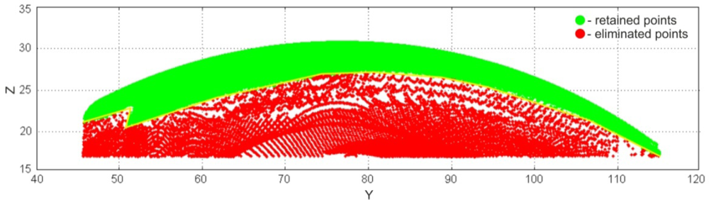 The very first pre-processing phase was the 3D filtering of resulting point data, which included volumetric filtering, filtering by segmented line, and elimination of individual points. Parameters used for volumetric filtering are listed in Table 4. The result was 175,315 filtered points, and 236,796 remaining points (Figure 20). Filtering by segmented line was performed in y-z plane. Knot points defining the segmented line are listed in Table 5 and the obtained result (filtered 12,013 and 224,783 remained points) is shown on Figure 21. In this case, the geometric form and spatial orientation of object were the cause of a larger number of left-over point-errors—a total of 367 points were eliminated manually, thus leaving 224,416 points (Figure 22).