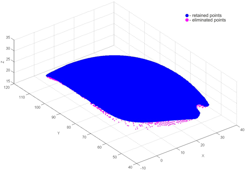 Point-data pre-processing was started by the application of the tools for 3D filtering of point data. Considering that the model is symmetric about the x-axis (i.e., y-z plane) point-data pre-processing was started by applying 3D filtering with a segmented line filter and a total of four segments. Coordinates of the knot points defining the filter line’s segments are given in Table 2. This resulted in a 351,292 filtered points (Figure 16).