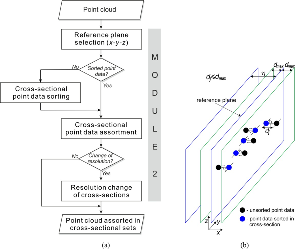 However, if the input point cloud is unsorted—i.e., point data is not sorted into sections or scanned lines—the system provides a sorting option. Point data is sorted within cross-sections parallel to the selected reference plane, by projecting all the points that pertain to defined tolerance zone. The number of cross-sections is directly related to the defined resolution (η), while the tolerance zone represents the band whose width is defined by the maximum allowed shortest distance (dmax) of the points from both sides of the reference planes (Figure 3(b)). It is obvious that a wider tolerance zone implies lower accuracy of the sorting.