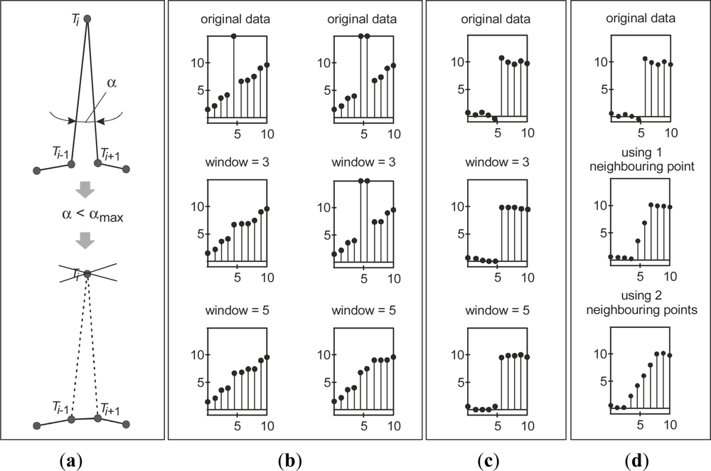 The angle method (b) is dedicated to elimination of outliers, i.e., impulse noise, and the principle is presented in Figure 4(a). The pre-defined angle value in SyPreF is α = 10°, and it can be optionally changed according to user’s needs.