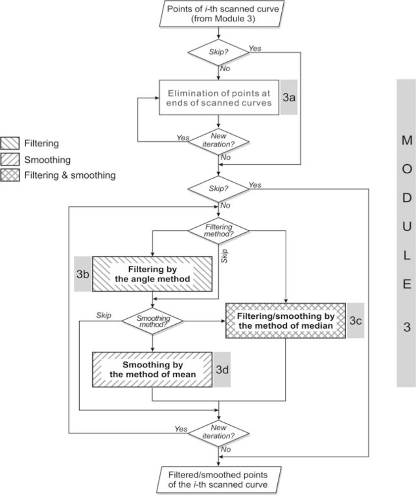 The function of this module is two-fold: filtering and smoothing of point data in cross-sections (scanned lines). It is dedicated to elimination of errors left after 3D filtering, as well as elimination of noise which affects the quality of the resulting surface model. The module is based on four tools: