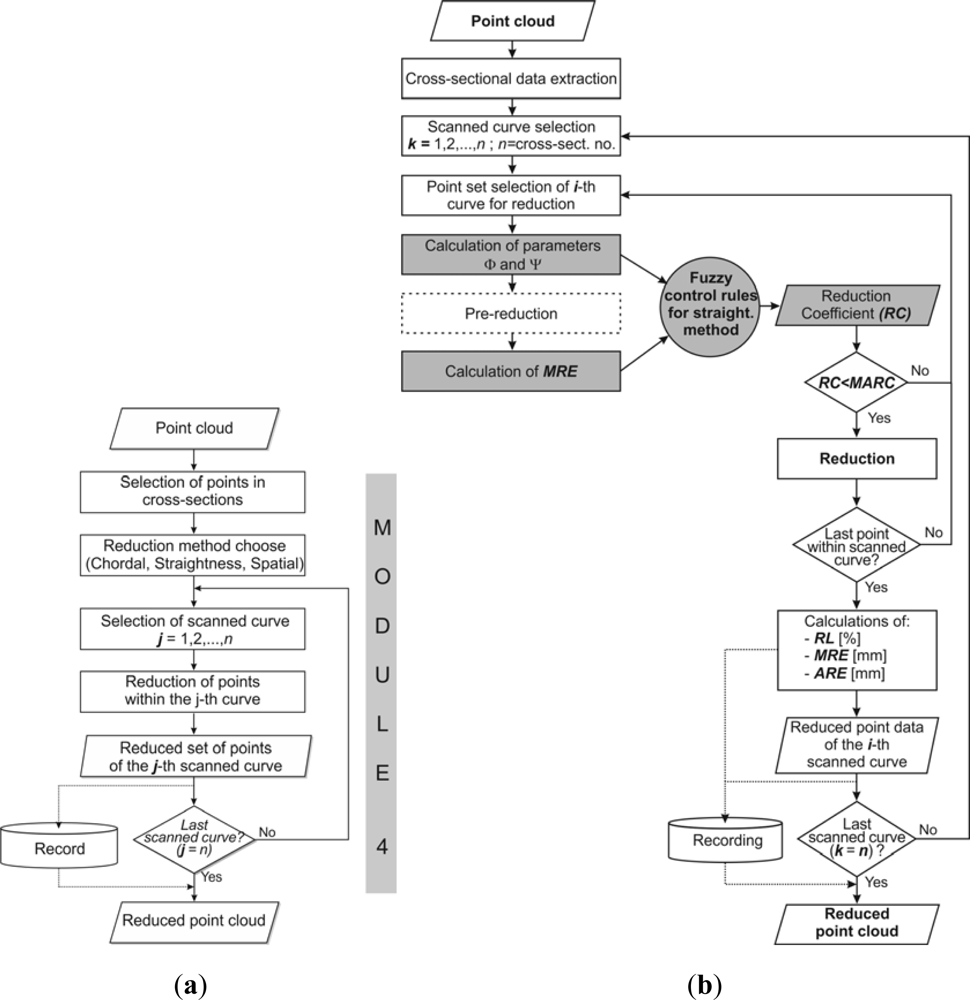 Major emphasis was placed on the module for point data reduction, which was designed according to a novel approach with integrated deviation analysis and fuzzy logic reasoning. Building on the weak spots and deficiencies of current approaches to reduction of point data by sampling methods—i.e., the lack of information on the level of deviation in reduced point clouds and necessity to employ parameters which are abstract to user—a novel approach was developed for analysis of the level of deviation of the reduced point cloud in comparison with the initial point cloud.
