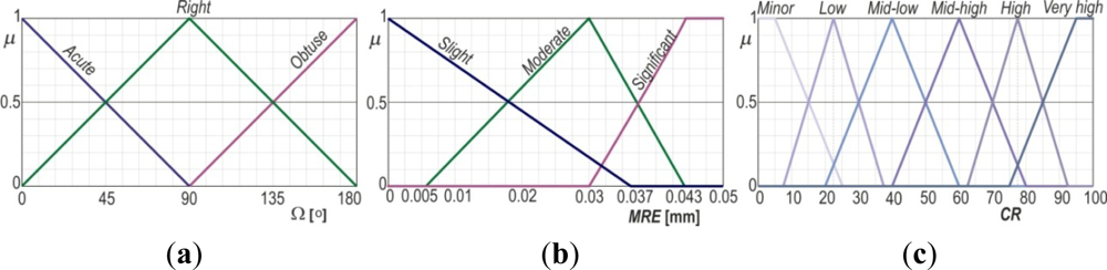 The input consists of two state variables—Ω and MRE (Figure 6(b)) whose real values are fuzzified into fuzzy sets with appropriate input spaces, where the fuzzy sets with input values are defined by appropriate membership functions. Triangular membership function was used for all membership functions. Considering the previously mentioned character of Φ and Ψ, as well as the practical experience with their values, for the input variable Ω an input space of 0° to 2·90° was defined, that is, from 0° to 180°. This space was segmented into three fuzzy sets using linguistic terms to describe angle characters: sharp, right and obtuse(Figure 8(a)).