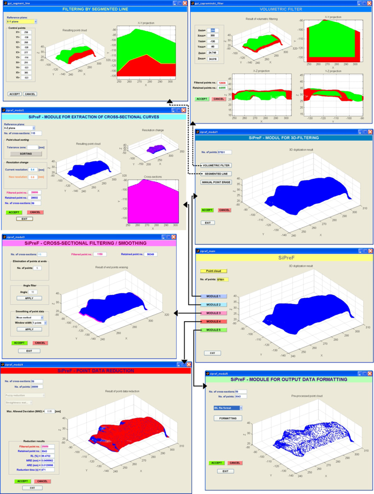 In realization of the SyPreF point data pre-processor, conventional programming tools as well as artificial intelligence (fuzzy logic) tools were used. SyPreF was developed in Matlab (MathWorks) 7.2 (Release 2006a), based on prerequisites explained in the previous sections. Graphical user interfaces of the modules are presented in Figure 9.