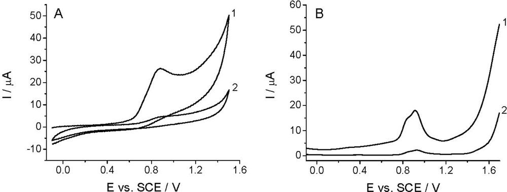 The voltammetric detection, as well as the determination of Linuron is based on its oxidation at the working electrode [26–29]. Among others, the quality of the analytical signal depens on the nature of working electrode, electrode pretreatment, supporing electrolyte, and the compound investigated. Figure 2 shows that the CV and DPV curves (curves 1) obtained in the BR buffer solution at pH 2.0 recorded with TCP-CPE working electrode contained one irreversible oxidation peak with Ep at around +0.9 V. The oxidation peak is wide and covers the potential range between +0.65 and +1.10 V, which makes difficult to measure within this potential range. This undesirable signal is also present in some another electrolytes (phosphate, sulfate, acetate), and it is assumed to be a result of the oxidation of the working electrode surface. Additionally, the residual current is too high; especially, from +0.7, narrowing the accessible potential window of the working electrode. As well known, electrochemical pretreatment (also termed electrochemical activation) of the working electrode surface is a widely used procedure to enhance sensitivity and selectivity in voltammetric analyses of organic compounds [52]. Both anodic (or cathodic) polarization performed at extreme potentials and anodic-cathodic cycling, are commonly employed procedures to pre-treat the surface of carbon electrodes, including CPEs [53,54], for which one can also utilize a special “surface erosion” with surfactants [55]. In order to obtain reproducible response, a lower residual current and wider potential window in the anodic range the TCP-CPE working electrode was subjected to electrochemical activation by potential cycling in the range from −0.1 to +1.60 V (10 cycles, v = 0.25 V s−1) in the blank prior to measurements. This pretreatment led to a significant improvement in the baseline characteristics in the case of both CV and DPV measurements (Figure 2, curves 2). Increasing the number of potential cycles (curves) lead to a further widening of the potential window, decreases of the mentioned oxidation peak an additional signal stabilization. During the electrochemical treatment the TCP-CPE did not lose its sensitivity.