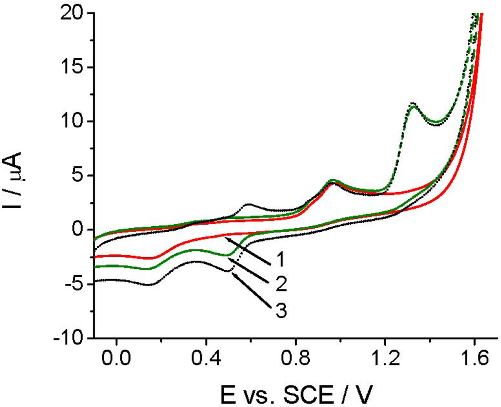Before applying TCP-CPE for quantitative determinations, it was also necessary to perform characterization of the target compound. As demonstrated at pH 2.0 (Figure 3), Linuron exhibited a rather complex electrochemical behavior. On the first cyclic voltammogram (curve 2), in addition to the peaks at +0.14 and +0.95 V, which are also present in the blank (curve 1), a well defined Linuron oxidation peak appears at +1.32 V. The oxidation of Linuron resulted in the appearance of a new reduction signal at around +0.5 V in the second potential half-cycle (Figure 3, curve 2). In the second cycle (after solution stirring), a counterpart of this signal appeared in the positive scan at ca. +0.6 V (Figure 3, curve 3). The appearance of these new signals corresponded possibly to the degradation products of Linuron [29]. The appearance of the new signals did not affected the intensity of the analytical signal, neither in CV nor in DPV mode, which allowed us to choose a simpler direct voltammetric determination also for achieving a good reproducibility.