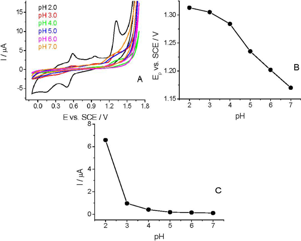 The CV curves were recorded in the pH range of 2.0–7.0 to study the effect of pH on the voltammetric behavior of Linuron. The sharpest and most favorably developed oxidation peak for Linuron was obtained in strongly acidic solution (pH 2.0). As clearly visible (Figure 4), both peak potential and peak current intensity depend on the pH of the supporting electrolyte. At pH > 3.0 the peak potential (Ep) is more pH-dependent than at lower pHs. This pH-dependency indicates the involvement of protons in the electrode reaction and that the proton-transfer reaction precedes the electrode process proper. Similarly to the earlier published experimental data [28,29], the Ep–pH plot [Figure 4(B)] for the main oxidation peak shows two linear parts with a break at approximately pH 4.0; the slope of the first part being 14.5 mV pH−1 and of the second one 37.5 mV pH−1.