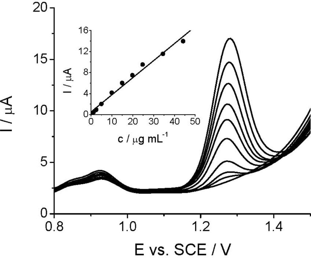 Voltammetry on TCP-CPE. Solutions were measured in 10.00 mL of Britton-Robinson (BR) buffer supporting electrolyte to which different concentrations of Linuron was added. The solutions were deaerated by passing a nitrogen stream through them for 5 min. The voltammograms were recorded at room temperature. Before each measurement, the buffer-immersed working electrode was electrochemically activated by potential cycling (with 50 cycles) in the range from −0.1 to +1.6 V using a scan rate, v = 0.25 V s−1. Before measuring Linuron, the blank signal was recorded in the supporting electrolyte. The scan rate in the cyclic voltammetric (CV) investigation of Linuron was 25 mV s−1. The DPV measurement parameters were as follows: start potential −0.1 V, end potential +1.6 V, pulse amplitude 50 mV, pulse width 50 ms, pulse time of 0.05 s, and scan rate 25 mV s−1. The model solutions and also the river water sample were measured without filtering.