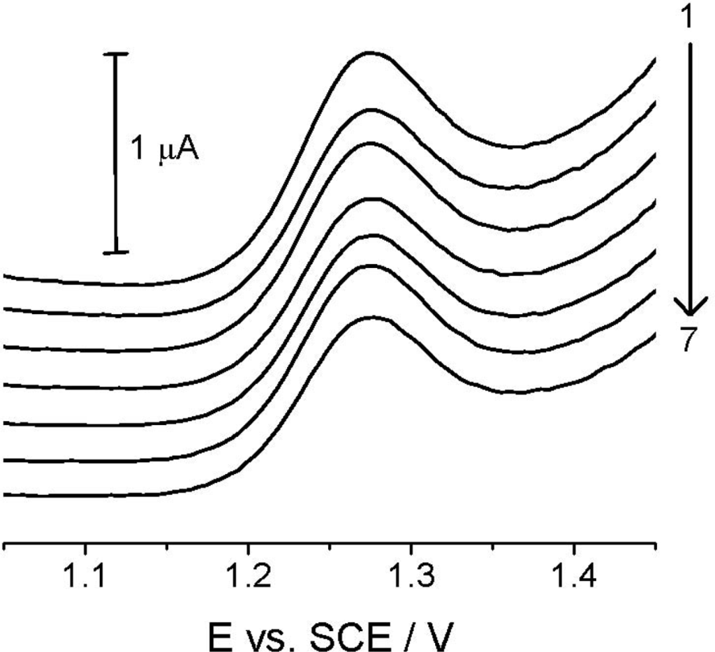 Reproducibility studies at TCP-CPE were also performed, first of all to check the signal stability and possible changes in its shape because of potentially approaching absorption/adsorption processes. Figure 6, in which records are presented for seven repeated measurements of the 4.99 μg mL−1 (2.00 × 10−5 mol L−1) Linuron solution, showing good reproducibility of the analytical signal in the time interval of approx. 30 minutes, with no significant changes in the electrode properties and the analyte signal itself during the experimentation.