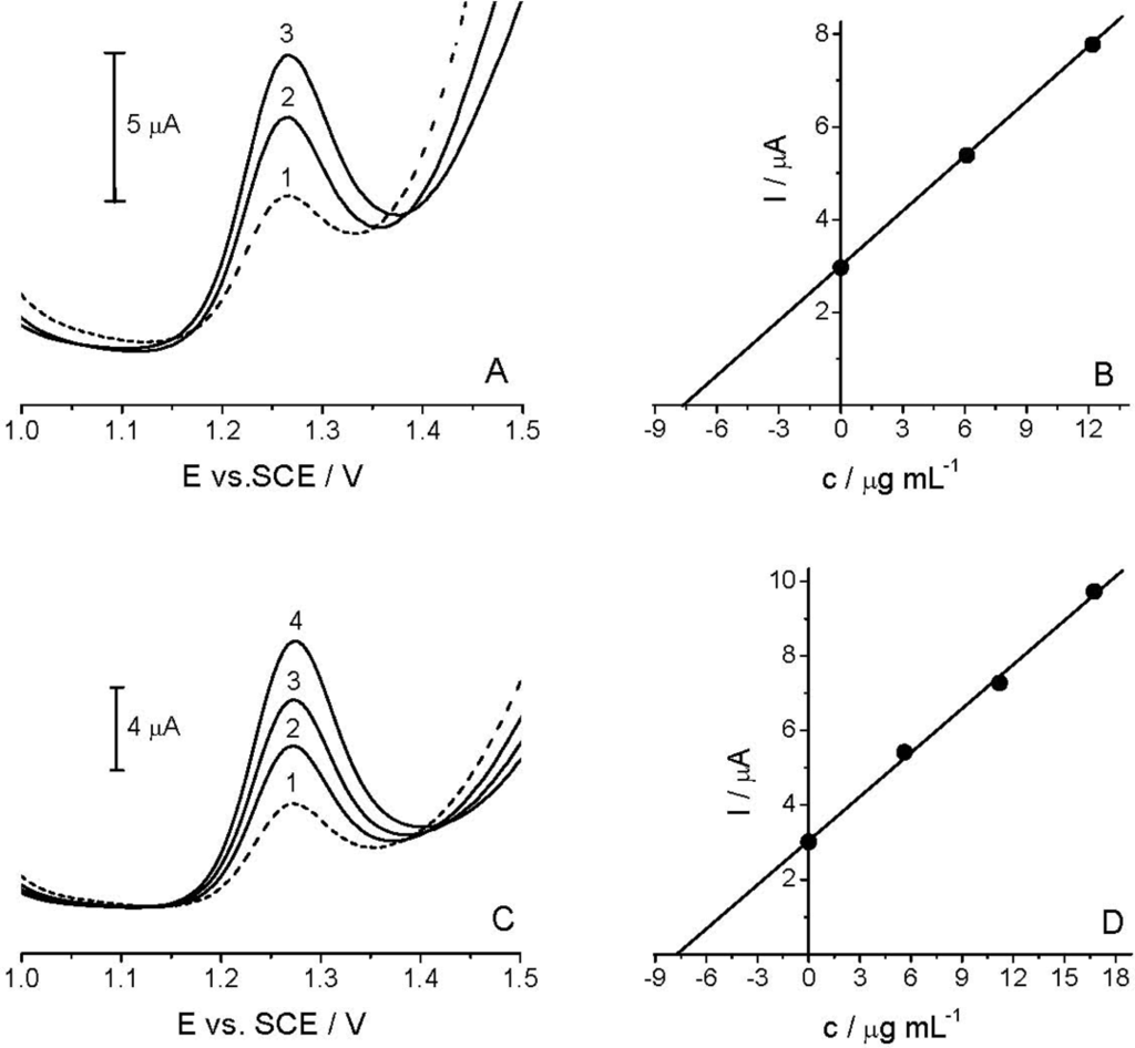 The applicability of the voltammetric procedure was tested by the determination of the Linuron in the spiked river water sample [Figure 7(A)] and commercial formulation Galolin mono [Figure 7(C)], using DPV with TCP-CPE.