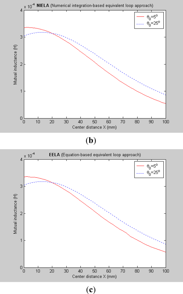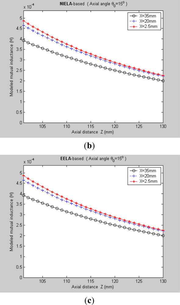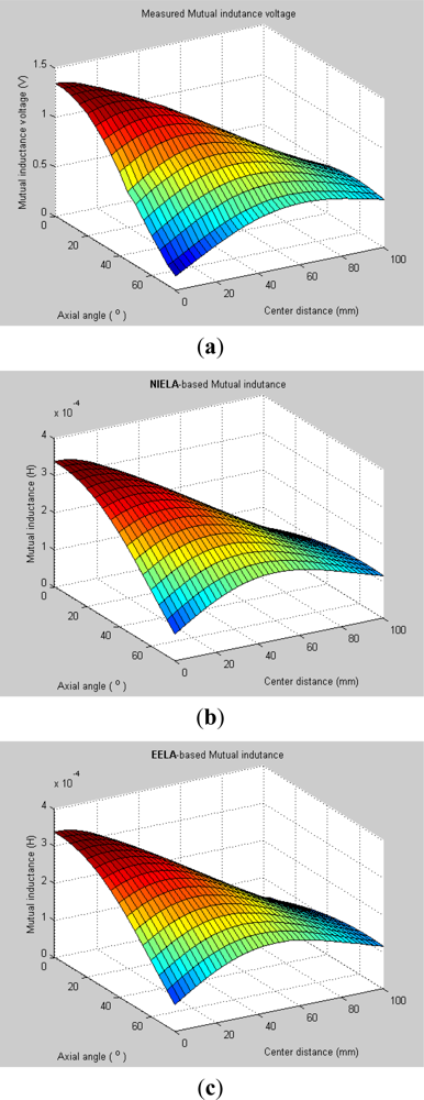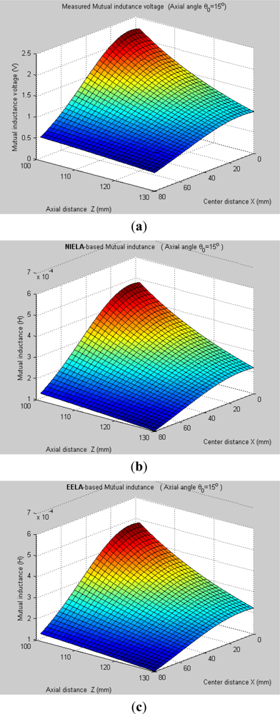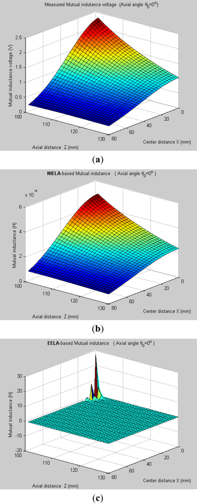 It can be seen, Figures 7 and 8 plot the 3-D graphs of (a) measured mutual inductance voltage, (b) NIELA-based mutual inductance and (c) EELA-based mutual inductance versus center distance X and axial distance Z between Solenoid I and II under two different conditions, respectively: